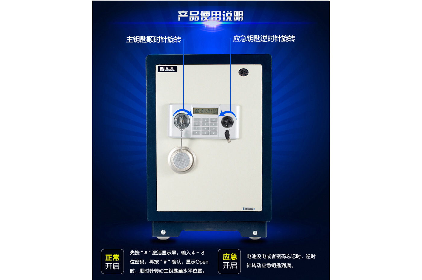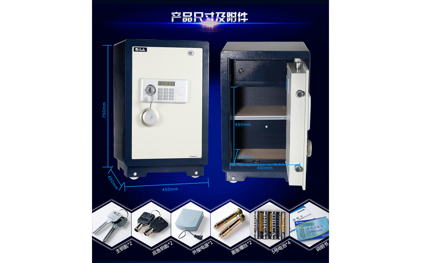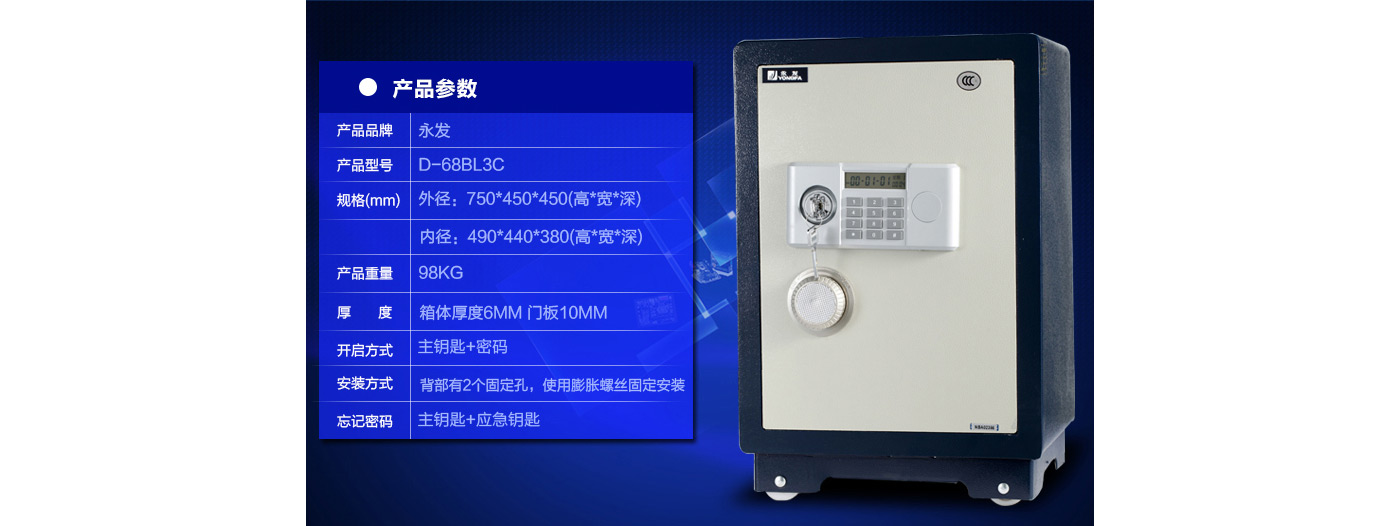 永發經典電子系列3C認證保險箱D-68BL3C尺寸說明:750高*450寬*450深mm(含底座) 重量:98kg