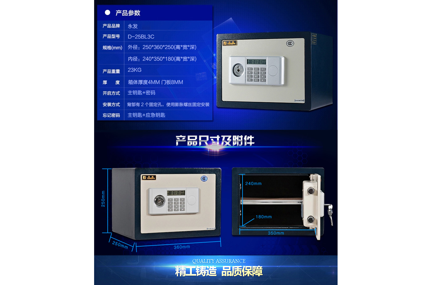永發經典電子系列3C認證保險箱D-25BL3C尺寸說明:250高*350寬*250深mm(含底座) 重量:23kg
