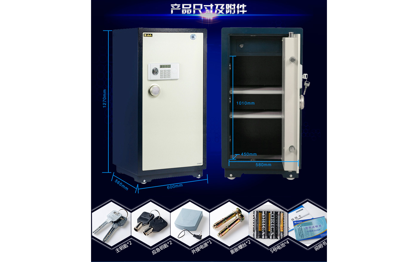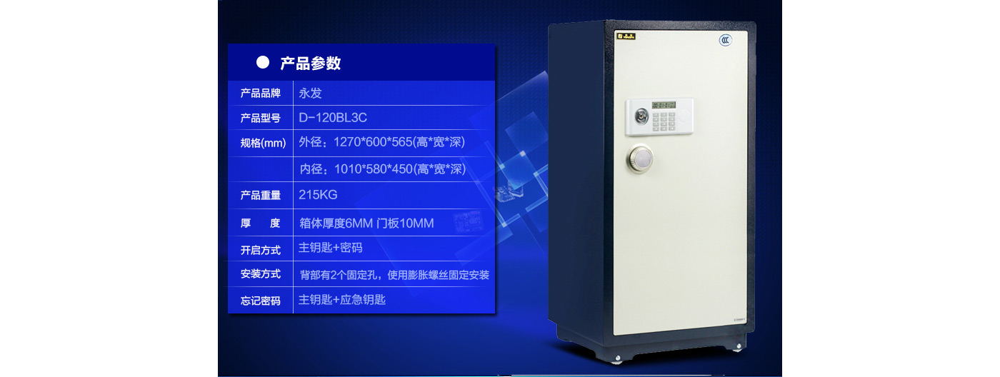永發經典電子系列3C認證保險箱D-120BL3C尺寸說明:1270高*600寬*565深mm(含底座) 重量:215kg
