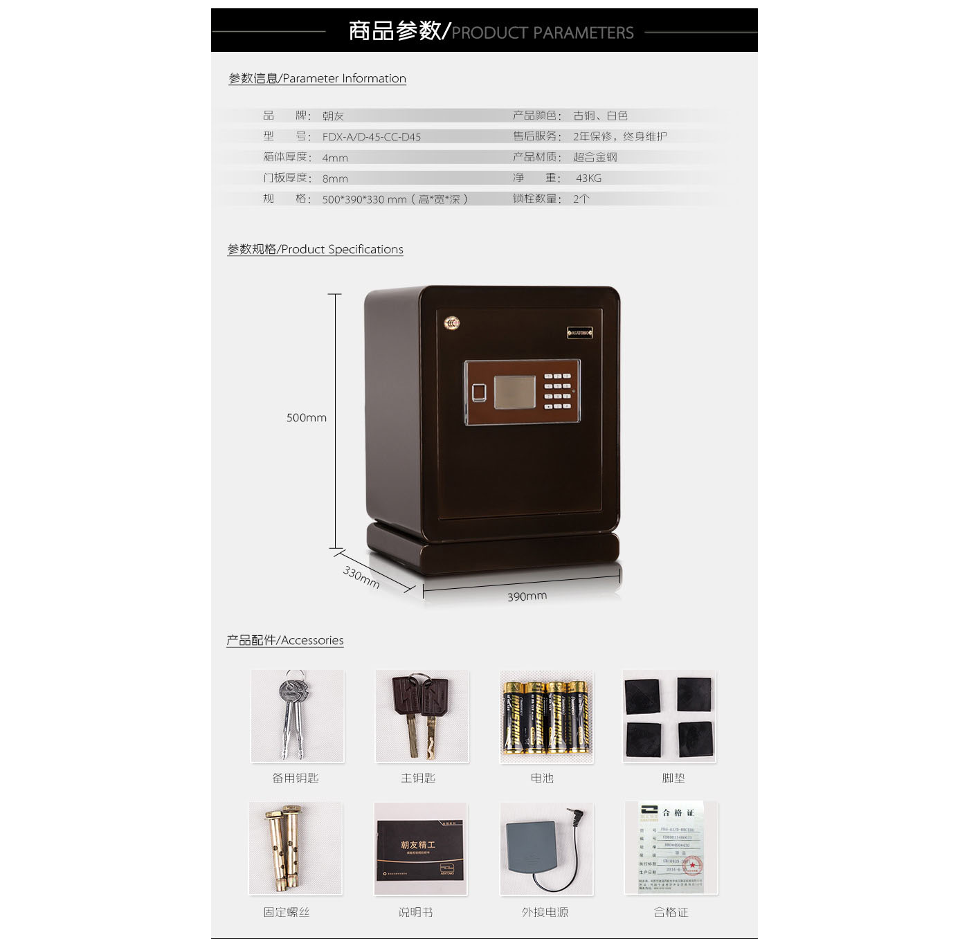 永發旗下朝友CC45金慧電子式3C保險柜尺寸說明:500高*390寬*330深mm(含底座) 重量:43kg