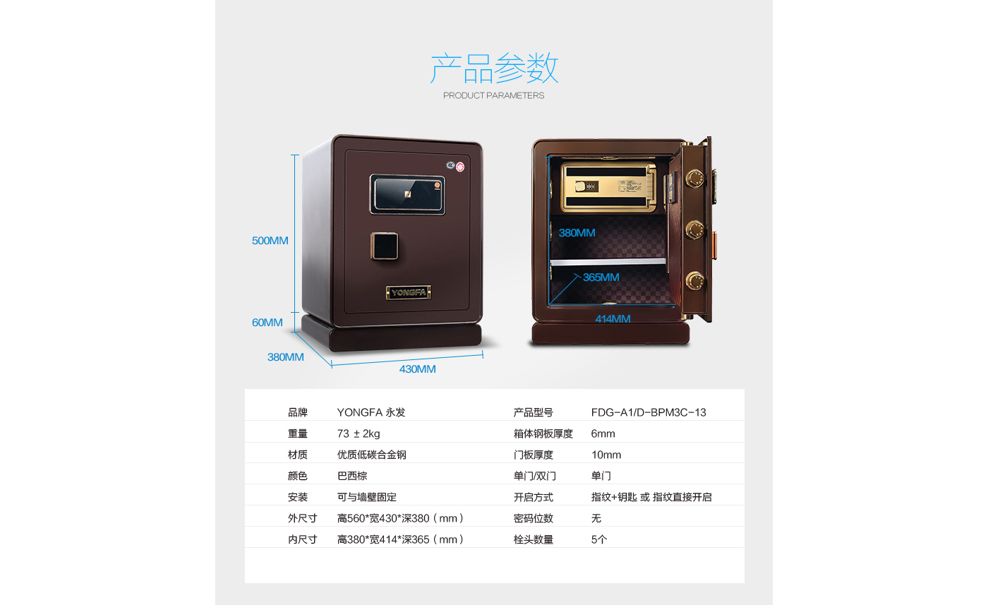 永發(fā)尚瑞系列指紋式3C保險(xiǎn)柜50BPM3C-13尺寸說(shuō)明:560高*430寬*380深mm(含底座) 重量:73kg