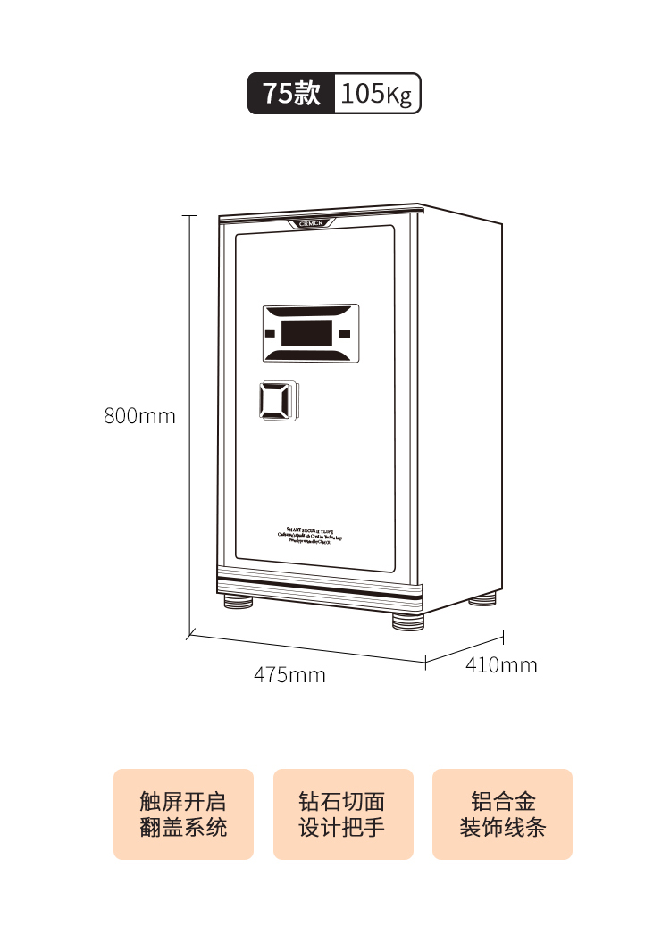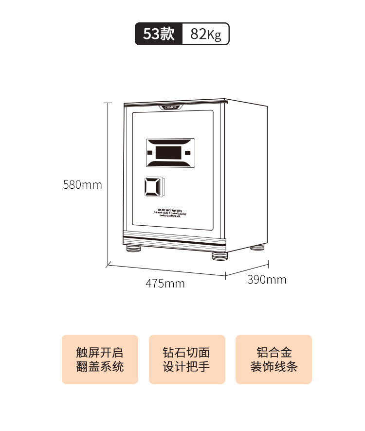 卡嘜百寶指紋+電子密碼系列3C認證保險箱D-45HTZW II尺寸說明:480高*470寬*370深mm(含底座) 重量:48.5kg